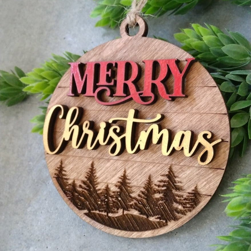 Merry Christmas Wood ornament. This ornament is beautiful. Dark stained wood back with a 3D layers look. Merry painted red and Christmas painted gold. A beautiful deep engraving of a line of pine trees on the bottom.