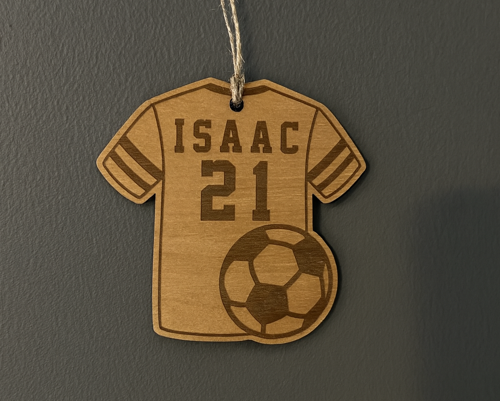 Celebrate your favorite soccer star with this custom wooden soccer jersey ornament! Each ornament is laser-engraved with your player’s name and number, complete with a classic soccer ball detail for the perfect touch.